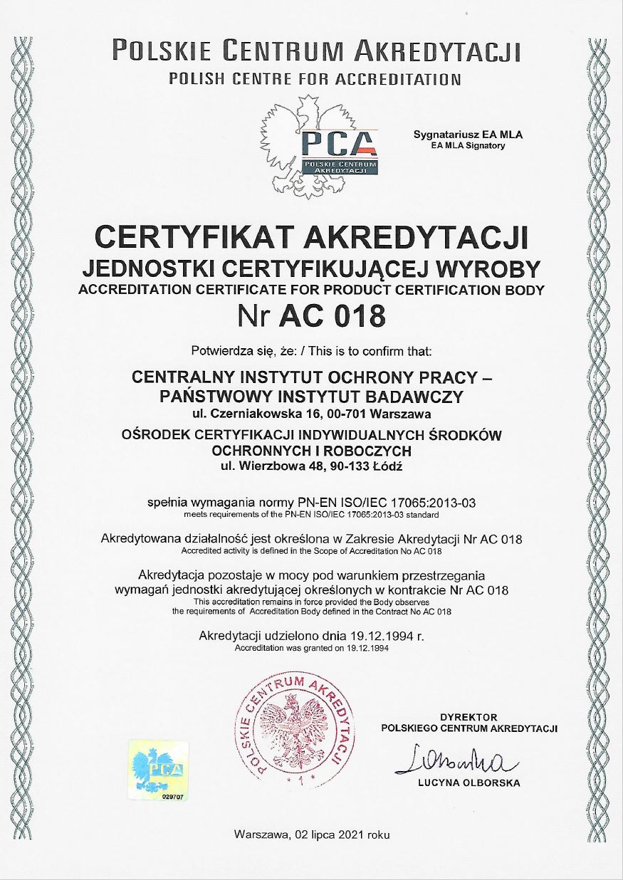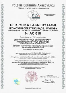 Centralny Instytut Ochrony Pracy - Państwowy Instytut Badawczy jest od połowy lat 90. XX w. akredytowaną jednostką certyfikującą wyroby. Aktualne kompetencje CIOP-PIB w zakresie certyfikacji wyrobów potwierdza certyfikat akredytacji nr AC 018, przyznany przez Polskie Centrum Akredytacji - krajowy organ akredytujący.