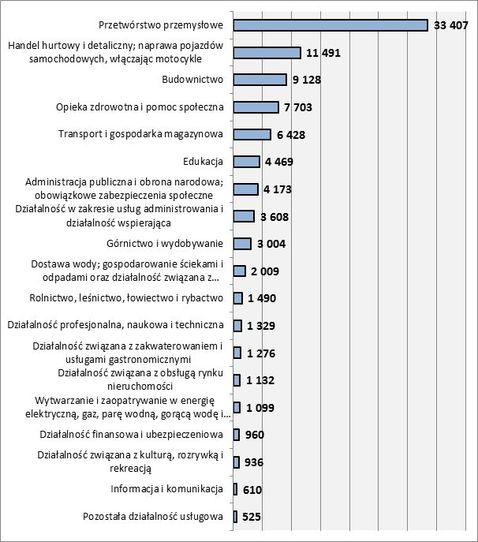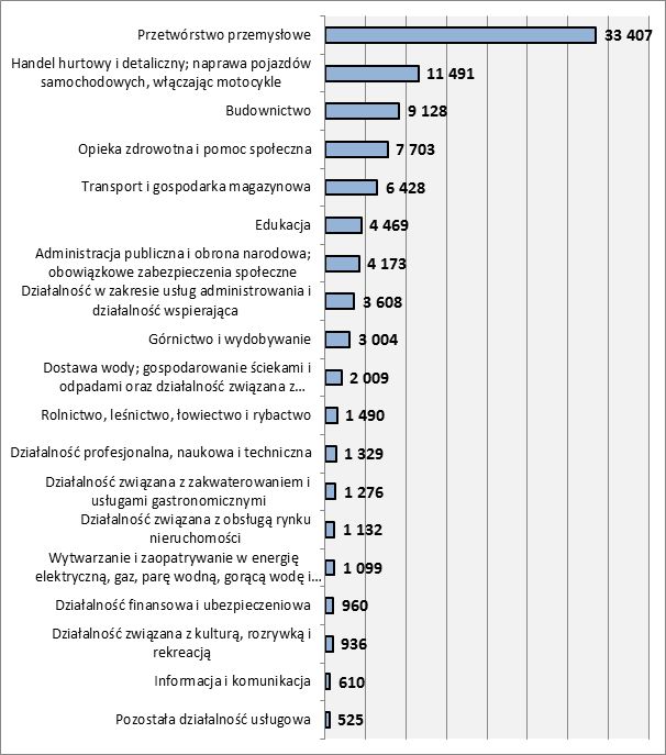 Rys. 6. Liczba wypadków przy pracy w poszczególnych sekcjach działalności gospodarczej
