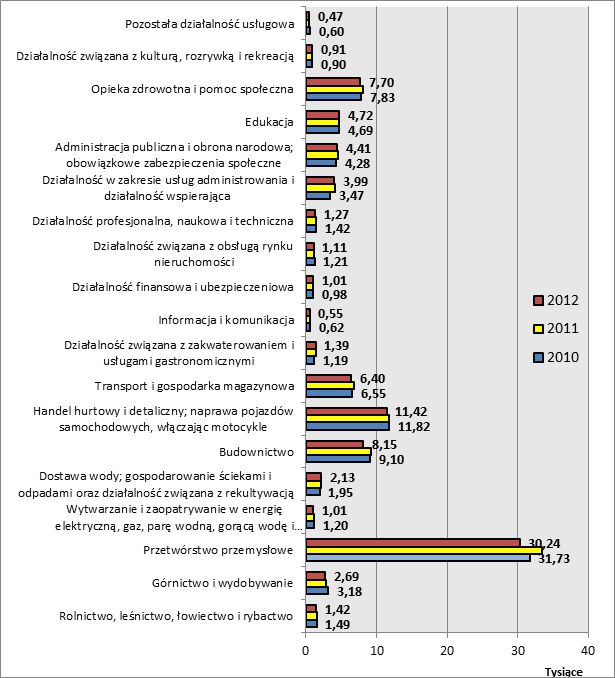 Do największej liczby wypadków przy pracy dochodzi w sekcji przetwórstwa przemysłowego (około 35% wszystkich wypadków przy pracy, rys. 5 i rys. 6, średnia liczba dla lat 2008-2012). W sekcji tej pracuje również największa liczba osób.