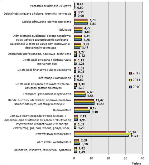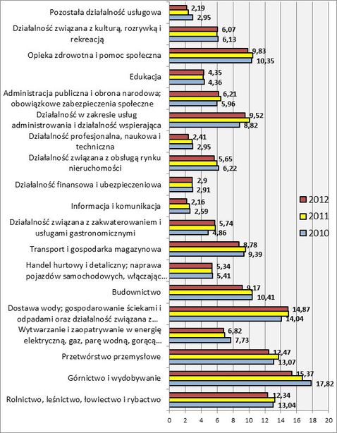 W latach 2010-2012 w większości rodzajów działalności gospodarczej odnotowano spadek liczby wypadków przy pracy, wyjątek stanowią sekcje związane z działalnością budżetową i usługową, w których w 2012 roku liczba wypadków przy pracy nieznacznie wzrosła, w porównaniu z latami poprzednimi: edukacja; administracja publiczna i obrona narodowa; obowiązkowe zabezpieczenia społeczne; działalność w zakresie usług administrowania i działalność wspierająca; działalność finansowa i ubezpieczeniowa; działalność związana z zakwaterowaniem i usługami gastronomicznymi; dostawa wody; gospodarowanie ściekami i odpadami oraz działalność związana z rekultywacją (rys. 6).
