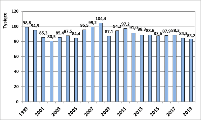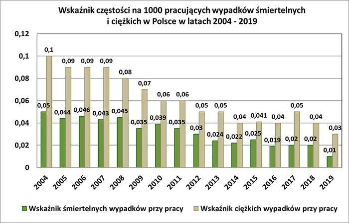 Analiza danych Głównego Urzędu Statystycznego wykazuje, że w latach 2000-2019 liczba wypadków przy pracy (rys. 1) nie uległa zasadniczym zmianom. Po krótkoterminowych okresach spadku w latach 2002, 2005 i 2009 następował ponowny wzrost liczby i wskaźnika wypadków. W roku 2012 odnotowano powrót do tendencji spadkowej, zarejestrowano 91 tys. wypadków przy pracy, czyli tyle ile wynosi średnia z okresu od roku 2000 do 2012. Zgodnie z tą tendencją w roku 2013 liczba wypadków zmniejszyła się do 88.3 tys., w latach 2013-2017 oscylowała wokół ok. 88 tys., aby w roku 2018 i 2019 stopniowo zmniejszyć się do 83,2 tys. (wg danych sygnalnych GUS z dnia 30.11.2020 r.).
