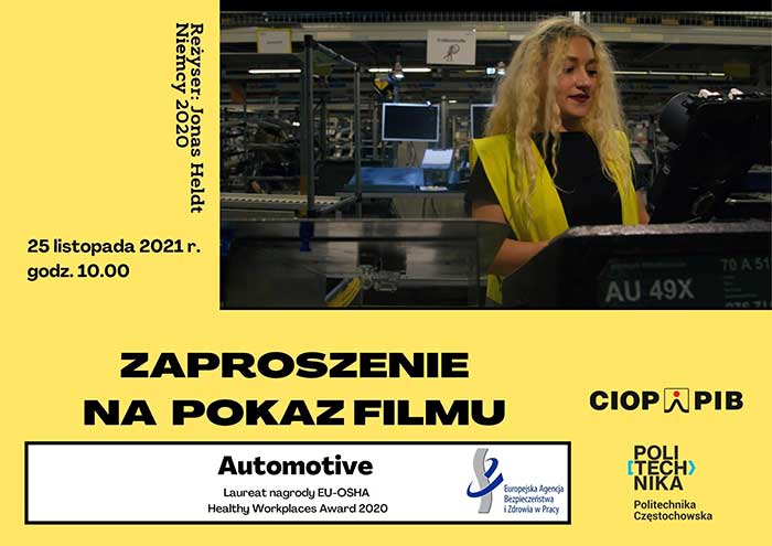 Film pt. Automotive to laureat nagrody “Healthy Workplaces Award 2020” przyznawanej przez  EU-OSHA. Reżyser: Jonas Heldt, Kraj: Niemcy, Rok: 2020, Czas trwania: 76', Język: niemiecki, napisy: PL-PT-RO