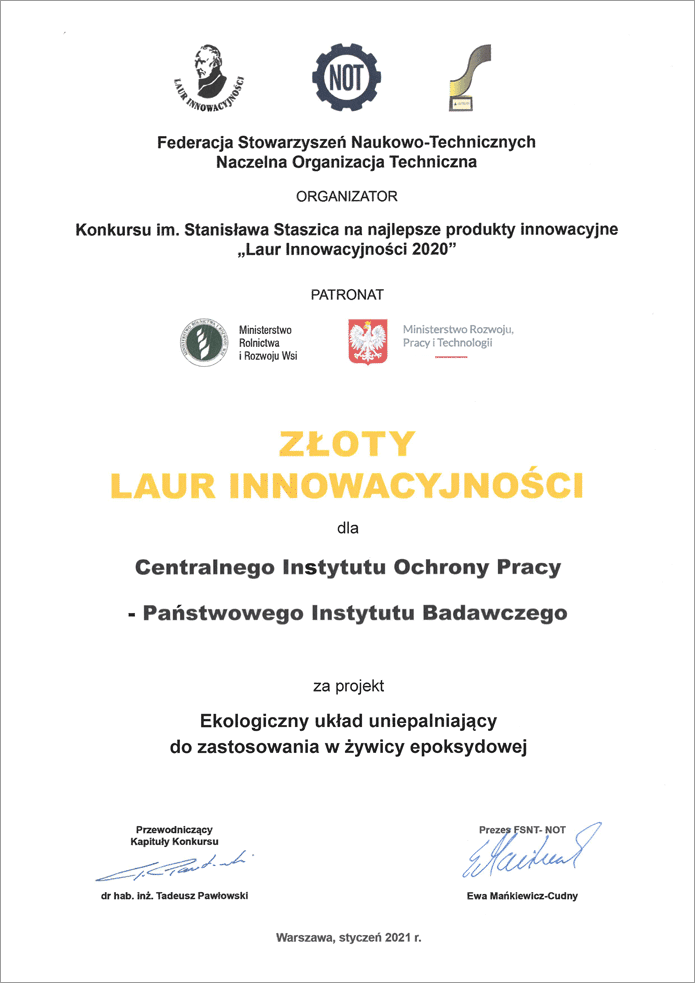 ZŁOTY LAUR INNOWACYJNOŚCI 2019 w Konkursie im. Stanisława Staszica organizowanym przez Naczelną Organizację Techniczną