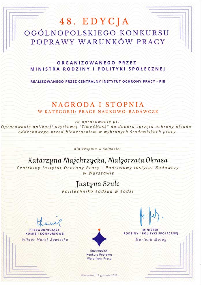 Nagroda I stopnia w Kategorii B – Prace naukowo-badawcze, 48. edycja Ogólnopolskiego Konkursu Poprawy Warunków Pracy