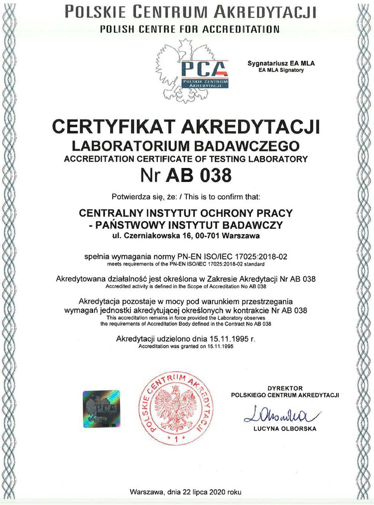Zespół Laboratoriów Badawczych CIOP–PIB posiada akredytację w ramach krajowego systemu oceny zgodności od dnia 15 listopada 1995 r. W ramach udzielonej akredytacji działalność laboratoriów badawczych Instytutu obejmuje następujące dziedziny: