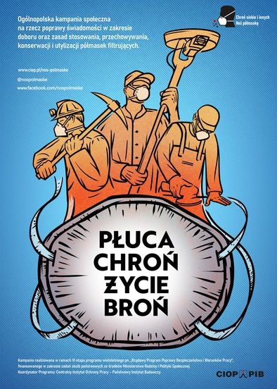 Kampania jest realizowana w ramach VI etapu programu wieloletniego pn. „Rządowy Program Poprawy Bezpieczeństwa i Warunków Pracy”, finansowanego w zakresie zadań służb państwowych ze środków Ministerstwa Rodziny i Polityki Społecznej. – 1. Etap zadania pt. „Kampania informacyjna „Chroń siebie i innych – Noś półmaskę” dotycząca właściwego stosowania filtrującego sprzętu ochrony układu oddechowego w środowisku pracy i życia”.