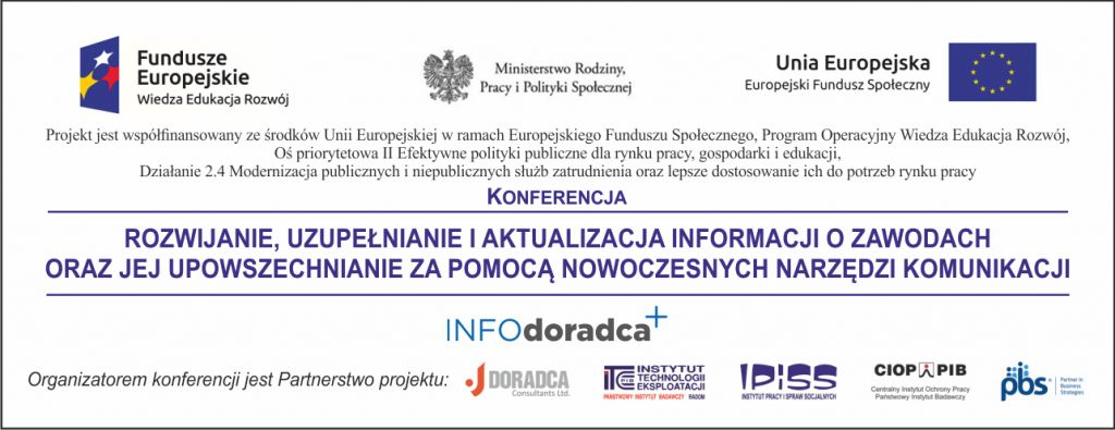 W związku z realizacją projektu „Rozwijanie, uzupełnianie i aktualizacja informacji o zawodach oraz jej rozpowszechnianie za pomocą nowoczesnych narzędzi komunikacji – INFODORADCA+”, współfinansowanego ze środków Unii Europejskiej w ramach Europejskiego Funduszu Społecznego, Program Operacyjny Wiedza Edukacja Rozwój, Oś priorytetowa II Efektywne polityki publiczne dla rynku pracy, gospodarki i edukacji, Działanie 2.4 Modernizacja publicznych i niepublicznych służb zatrudnienia oraz lepsze dostosowanie ich do potrzeb rynku pracy, w dniu 15 grudnia 2017 r. w Warszawie w Centrum Partnerstwa Społecznego “Dialog” im. A. Bączkowskiego odbyła się konferencja pt. „Rozwijanie, uzupełnianie i aktualizacja informacji o zawodach oraz jej rozpowszechnianie za pomocą nowoczesnych narzędzi komunikacji“.
